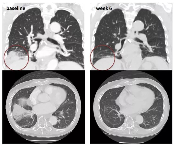 非小细胞肺癌靶向NRG1-CD74治疗前及治疗6周后CT影像:患者咳嗽消失,肿瘤缩小