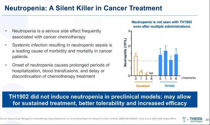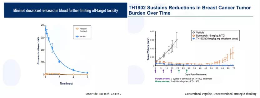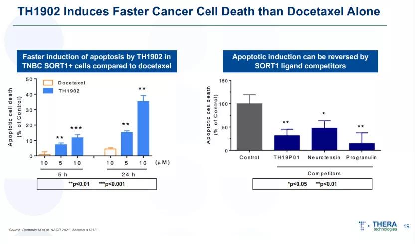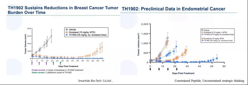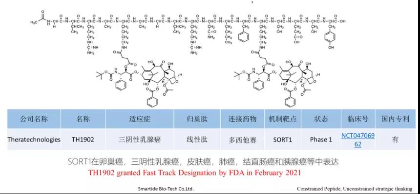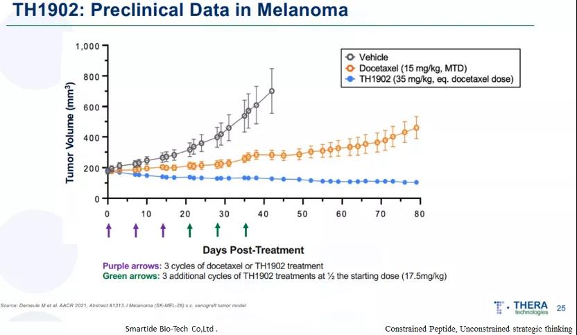 Theratechnologies开发的新型肽可与成熟的抗癌药物(如多西他赛,阿霉素或酪氨酸激酶抑制剂)结合,以特异性靶向Sortilin受体,这种方法具有改善药物安全性和有效性的潜力。该技术是2019年2月Theratechnologies以$5.3Mn收购Katana Biopharma(2016年成立)获得的,与此同时还获得了后者的PDC产品管线,包括TH1902(多西他赛-多肽偶联物和TH1904(阿霉素-多肽偶联物)(图23,图24,图25),TH1902临床前数据显示其在多种肿瘤中具有良好的疗效,且无系统毒性。