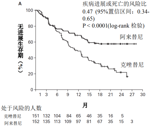 该III期临床试验共入组303例患者,其中151例患者随机入组到克唑替尼组,152例患者随机入组到阿来替尼治疗组,以推荐剂量600mg每日两次接受口服本品治疗。