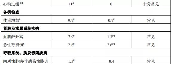 #在临床试验BO28984中报告的事件和/或发生率;N=152例患者接受了本品治疗;(注:其他未标注#的为在临床试验NP28761和NP28673中报告的事件和/或发生率;N=253例患者接受了本品治疗)。对于同一个不良反应,表中列举是BO28984或NP28761和NP28673中较高的数值。