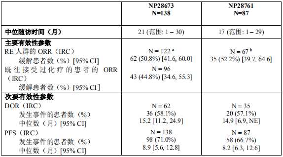 CI=置信区间;DOR=缓解持续时间;IRC=独立审查委员会;NE=不可估计;ORR=客观缓解率;PFS=无进展生存期;RE=缓解可评价