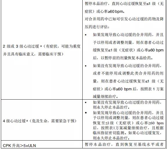 心动过缓:本品治疗可发生症状性心动过缓(参见【不良反应】)。应根据临床指征监测心率和血压。如果发生无症状心动过缓,则无需调整剂量(参见【用法用量】)。如果患者发生症状性心动过缓或危及生命的事件,应对合并用药中已知引发心动过缓的药物以及降压药进行评估,并按表2所述调整本品治疗的剂量(参见【用法用量】和【药物相互作用】)。