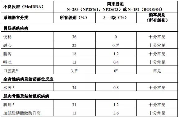 在关键性III期临床试验BO28984与II期试验NP28761和NP28673中,阿来替尼的安全性特征大体一致。