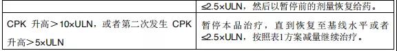 建议患者报告任何原因不明的肌痛、触痛或虚弱。评估CPK水平,在第一个月治疗期间每两周评估一次,随后在临床上根据患者报告的症状按需进行评估。根据CPK升高的严重程度暂停本品治疗,然后恢复治疗或降低剂量(参见【用法用量】)。
