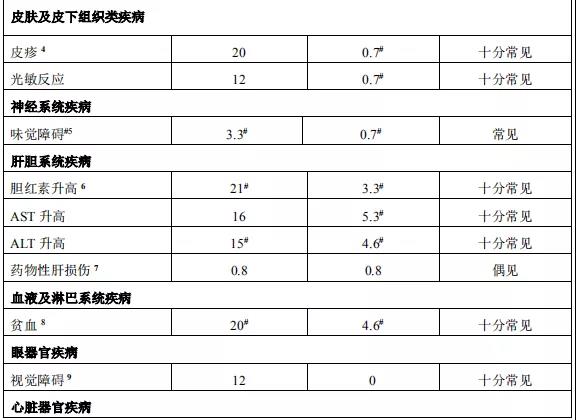 肝毒性:本品的关键性临床试验中,患者发生了ALT和AST升高>5×正常值上限(ULN)以及胆红素升高>3×ULN(参见【不良反应】)。大多数事件发生于最初治疗3个月内。在关键性临床试验中,3例3-4级AST/ALT升高的患者发生了药物性肝损伤。在临床试验中,1例接受治疗的患者同时发生ALT或AST升高≥3×ULN和总胆红素升高≥2×ULN,碱性磷酸酶正常。
