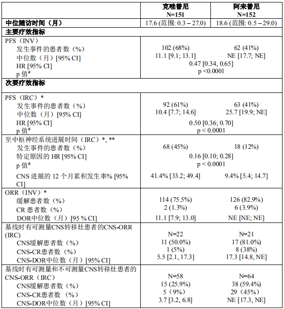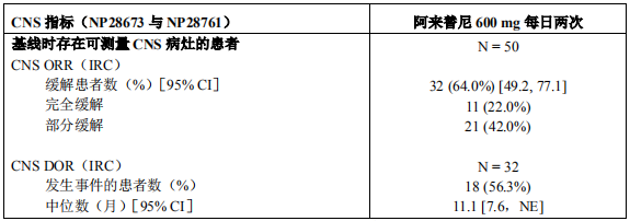 CI=置信区间;CNS=中枢神经系统;CR=完全缓解;DOR=缓解持续时间;HR=风险比;IRC=独立评审委员会;INV=研究者;NE=不可估计;ORR=客观缓解率;PFS=无进展生存期