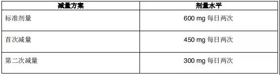 剂量调整:如治疗过程中出现不良事件,可能需要暂时中断给药、降低剂量或者停止本品治疗。应根据患者耐受性,以每次减量150mg 的方式逐步降低本品的剂量。如果患者不能耐受300mg 每日两次的给药剂量,应该永久停止本品治疗。