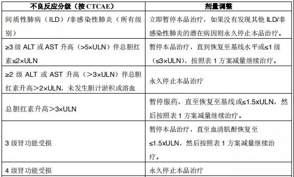 【注意事项】间质性肺病(ILD)/非感染性肺炎:本品临床试验中已报告间质性肺病/非感染性肺炎病例(参见【不良反应】)。应监测患者是否出现ᨀ示有非感染性肺炎的肺部症状。确诊患有间质性肺病/非感染性肺炎的患者应立即中断本品治疗,如果没有发现其他间质性肺病/非感染性肺炎的潜在病因,则应永久停药(参见【用法用量】)。