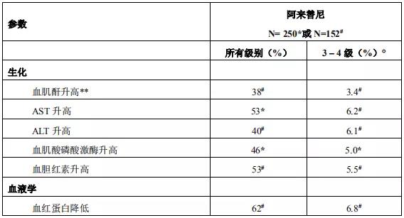 重度肌痛和CPK升高:在三项临床试验(NP28761、NP28673、BO28984)中,28%接受阿来替尼治疗的患者报告了肌痛,包括肌痛事件(22%)和肌肉骨骼疼痛(7.4%)。多数事件为1或2级,3例患者(0.7%)发生3级事件。仅2例患者(0.5%)因不良事件需要调整阿来替尼的剂量;没有患者因为肌痛事件退出阿来替尼治疗。362例具有CPK实验室数据的患者中,43%的患者发生CPK升高,3级CPK升高的发生率为3.7%,至3级CPK升高发生时间的中位数为14天。3.2%的患者因CPK升高而调整剂量;没有患者因为CPK升高退出阿来替尼治疗。关键性III期临床试验BO28984中,尚无重度肌痛的报告;接受阿来替尼治疗的患者和接受克唑替尼治疗的患者分别有2.6%和1.3%报告3级CPK升高;至发生3级CPK升高发生时间的中位数分别为27.5天和369天。