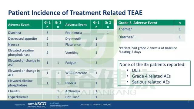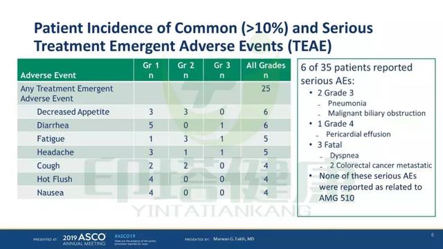 与AMG510治疗相关的3级不良反应有贫血、腹泻;DLTs、4级药物相关不良反应以及严重药物相关不良反应在35名患者中没有出现。