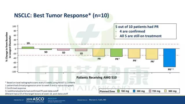 3、初步观察到AMG510单药治疗KRAS G12C NSCLC患者的抗肿瘤活性,10例NSCLC患者中有5例部分缓解(4例已确认)。