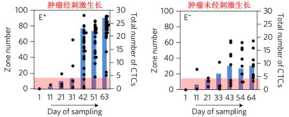 为了将MagRC技术应用到追踪CTCs动态显型中,研究人员采用两种荷瘤小鼠模型,即肿瘤经刺激生长与未经刺激生长。通过采血分析,研究人员发现两种模型小鼠血液内的CTCs数量随时间增加而增加,且经刺激的小鼠血液内CTCs比未经刺激的更多。此外,经刺激的小鼠血液内CTCs的显型会持续变化,而未经刺激的则趋于稳定。