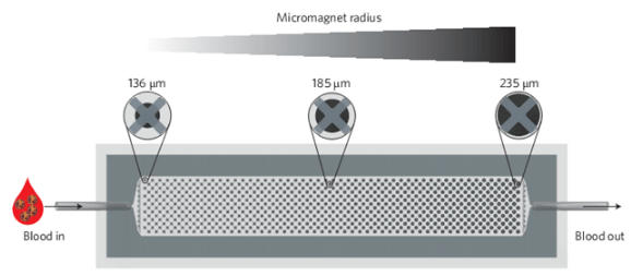 研究人员所发明的MagRC技术是利用免疫磁性分离法,依据CTCs表面标记物的表达量来进行分类。他们首先将血液样品与抗体修饰的磁性纳米粒子相孵育,使CTCs表面特异性地结合上磁性纳米粒子。CTCs表面标志物表达量越多,结合的纳米粒子也就越多。接着,将样品注入到微流控装置中,该装置内从左到右有不同半径的微型磁体,以此产生一个磁场梯度。结合有较多纳米粒子的CTCs在低磁场强度的区域内即可被捕获,而结合较少纳米粒子的CTCs会在高磁场强度的区域内被捕获,再通过免疫荧光使捕获的CTCs可视化,最终实现对CTCs的分类。