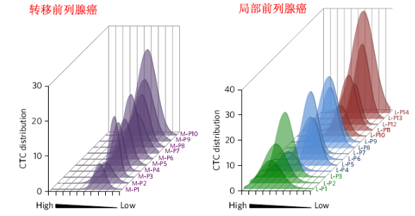 最后,研究人员采用MagRC技术对患有转移前列腺癌与局部前列腺癌病人血液内的CTCs进行检测与分类。研究结果表明,相比于患有转移前列腺癌的病人,患有局部前列腺癌病人血液内CTCs的显型呈现出更大的多样性。