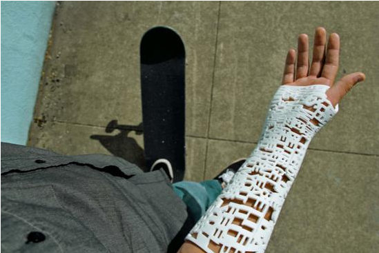想象一下,你某一个肢体发生断裂或扭曲,你需要安装一个固定部件。以前,这种情况需要这样的繁琐过程:将石膏安装到你身体的受伤部位,随后因为炎症消退或肌肉萎缩,你需要频繁看医生以多次安装石膏。而如今,医生只是扫描你的手臂,使用创伤学家批准的软件,几秒钟内就可以打印出一个防水性能好、轻量级的铸件,随后你就能回家了。下次看医生时,你的医生只需要弹开它检查伤口。这种技术对于病人和医生双方而言,都更便宜,更快捷,更方便。