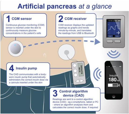 传统的糖尿病病人每天需要规律的指尖测血、注射胰岛素,这种设备把病人解放出来,不仅更轻松,而且能更精确地控制血糖,例如在晚上。人造胰腺工作的具体流程是: