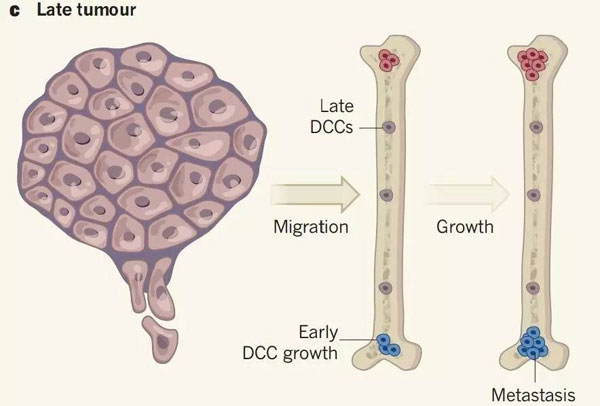 ▲晚期肿瘤也有癌细胞扩散到骨髓,但是这些癌细胞在骨髓的定殖能力显然不如早期就扩散过来的癌细胞(7)。