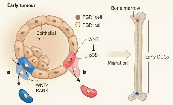 Klein博士团队的课题负责人Hedayatollah Hosseini,在小鼠长到9周之前,取出小鼠乳腺导管的上皮细胞,分析上皮细胞的基因表达情况(6)。Hosseini发现是孕激素(progesterone)导致了癌细胞的扩散。乳腺导管上皮细胞有两种,一种有孕激素受体,一种没有。有孕激素受体的上皮细胞,在孕激素的刺激下,会分泌两种特殊的蛋白质(WNT4和RANKL),正是这两种蛋白质诱导没有孕激素受体的细胞脱离了乳腺导管,最终进入骨髓。