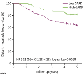 他们还对五组数据中的一组,来自Erasmus的263名乳腺癌患者进行了放疗后的追踪,统计了他们5年无转移生存期的情况。在这部分患者中,GARD值大于等于38.9的属于高GARD值人群,小于的属于低GARD值人群,追踪结果说明,高GARD值人群的放疗效果的确更好,同样的时间内,患者的存活率相对较高。