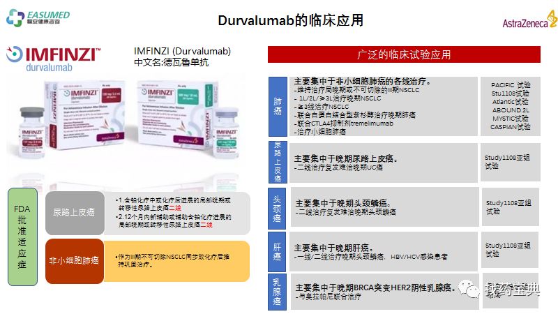 肺癌的免疫治疗临床地位逐渐被确立,但是不少医生及患者朋友仍然不知道如何使用,III期巩固维持?联合化疗?后线治疗?疗效如何,怎么用?今天小编就PDL1单抗IMFINZI(Durvalumab)的肺癌临床应用为大家展示一下肺癌免疫治疗丰富的临床应用!