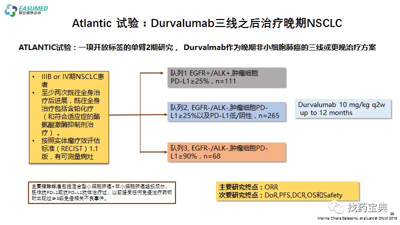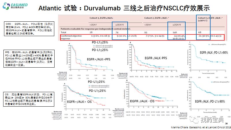 在早期试study1108的研究中,就谈到了Durvalumab在晚期NSCLC1-3线的疗效率。针对三线之后的22%的有效率开展了更大的II期试验ATLANTIC研究。该研究分三个亚组。EGFR/ALK-PDL1阳性的患者群ORR达到16.4%,PDL1高表达的达到30.9%。即使EGFR/ALK+的PDL1阳性的患者中也能达到12.2%的有效率。晚期肺癌三线之后治疗数据尚可。