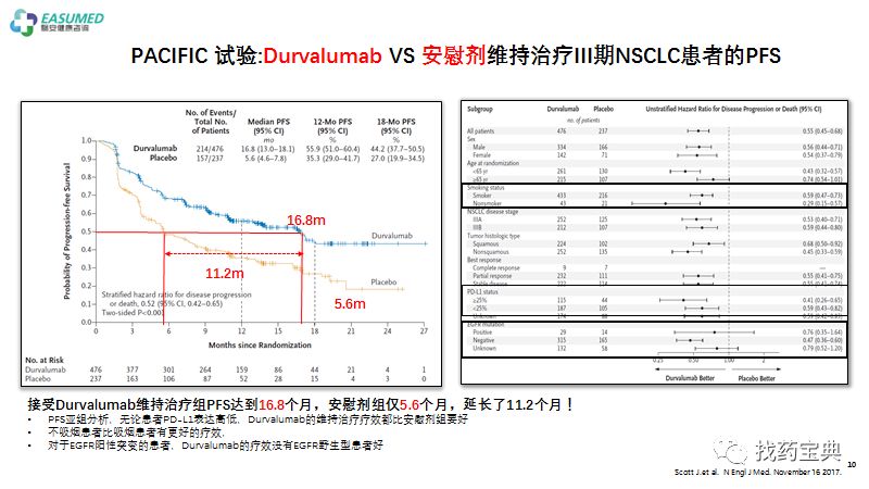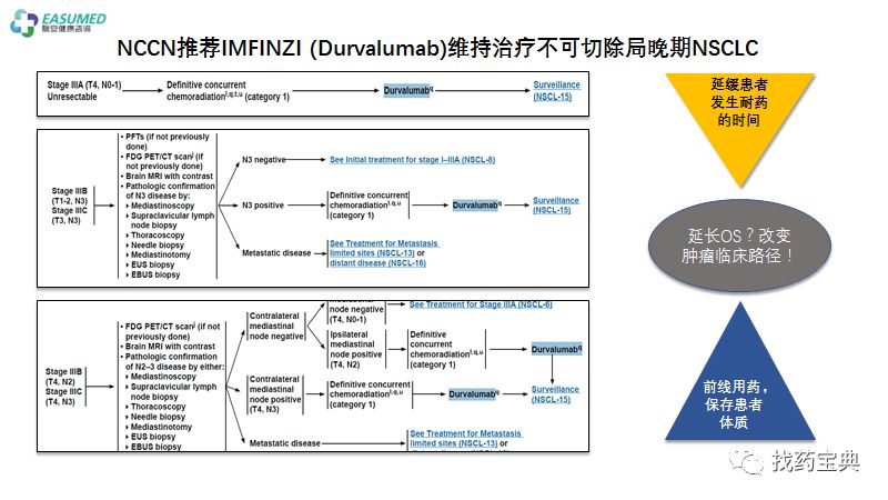 部分III期A及IIIB、IIIC的非小细胞肺癌患者丧失手术机会,标准的治疗是同步的放化疗,部分改良为放疗前后序贯化疗,或单独的化疗,在至少2周期化疗方案后患者病情不进展的情况下,以Durvalumab单药维持巩固1年,患者可获得16.8个月的无进展生存!极大地延缓了患者的整个病程,同时保存了患者的体质,期待在总生存上带来获益。该用法已获FDA批准,也写进了肺癌指南,只不过目前由于经济原因受限,但期待未来能给此类患者带来长足优势!