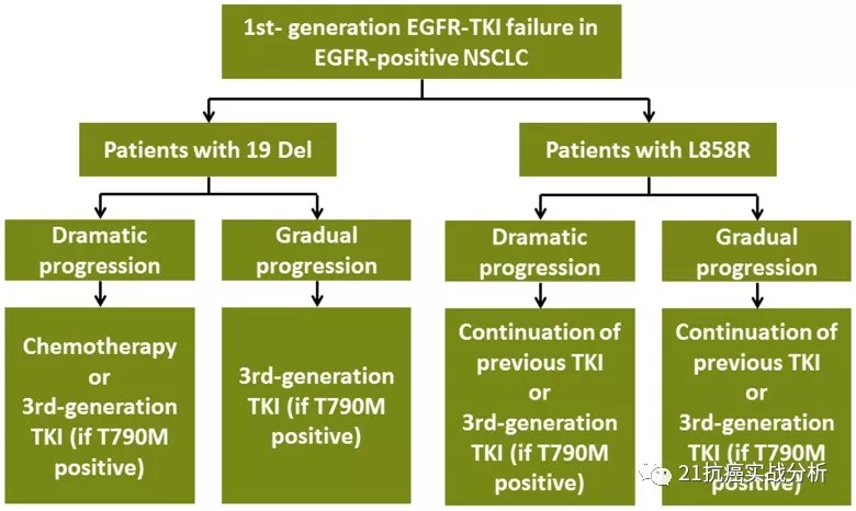 下图也思考了19和21突变一代药耐药后的治疗方式的选择应有所不同: