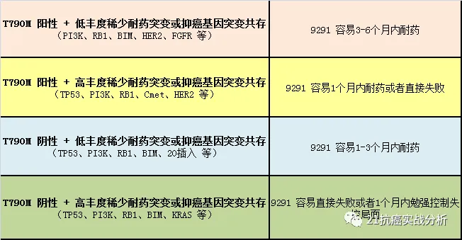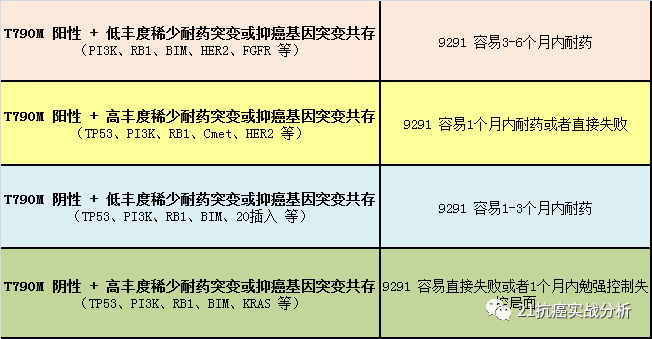 2)获得性耐药突变T790M丰度低或者阴性,最容易和其它稀少抑癌基因突变共存(尤其TP53基因), 导致9291在1-3个月内耐药或者直接无效。