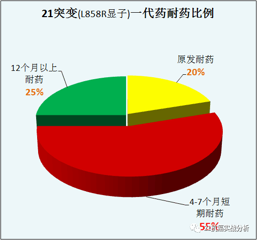 图中25%比例的病友可以幸运的吃一代药(易瑞莎、特罗凯、凯美纳)超出一年以上不耐药,既超过12个月。