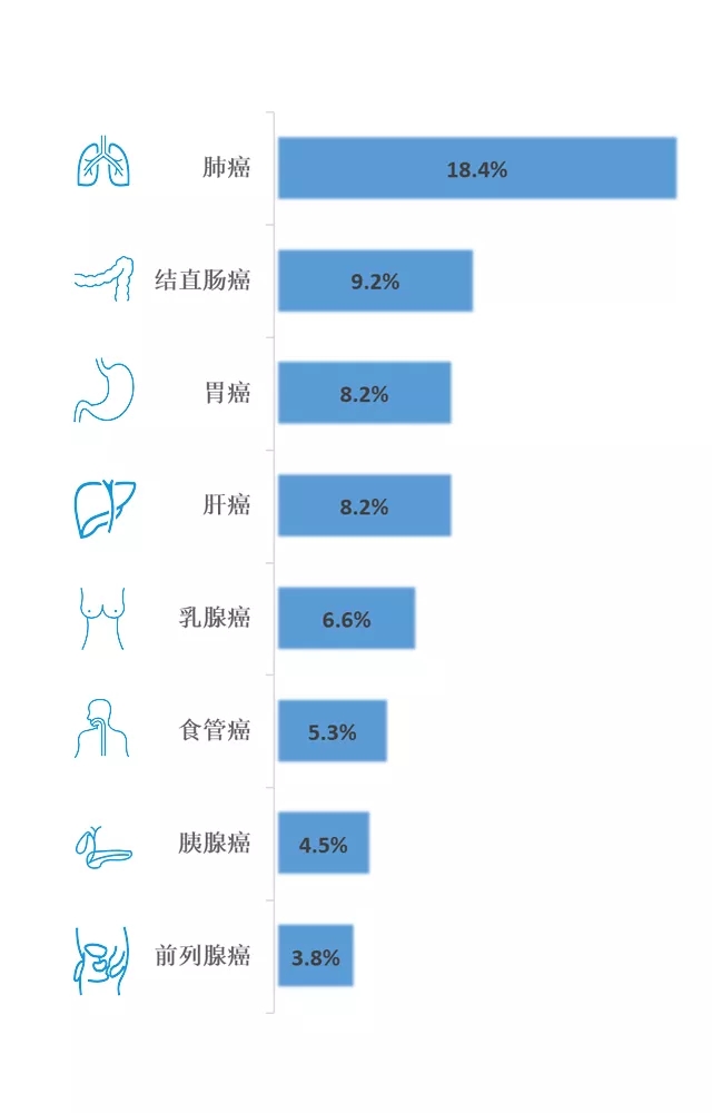 注释:在男性与女性的合并人群中,肺癌是最常被诊断的癌症(占总病例数的11.6%),并且是癌症死亡的主要原因(占癌症总死亡人数的18.4%)。紧随其后发病率居高的分别为乳腺癌(11.6%),前列腺癌(7.1%)和结直肠癌(6.1%);死亡率居高的分别为结直肠癌(9.2%),胃癌(8.2%)和肝癌(8.2%)。