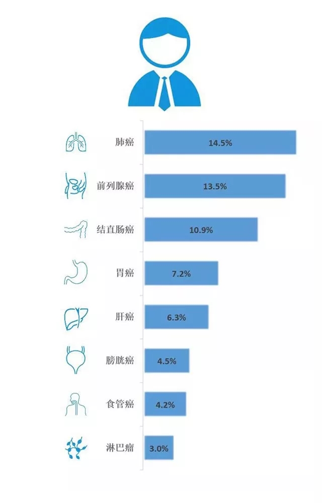 全球范围内,一生中(0~79岁)的患癌几率因性别有所差异,男性约1/3,女性约1/5。男性最常见的是前列腺癌,气管、支气管和肺癌,占40%;女性则是乳腺癌、结直肠癌和皮肤癌,也占40%左右。