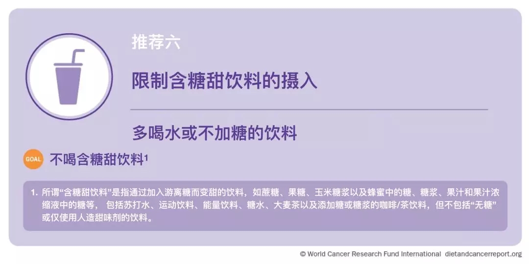 来自CUP的有力证据表明,经常或大量饮用含糖甜饮料是儿童和成人体重增加,超重/肥胖的原因;含糖甜饮料提供能量,但不提供饱腹感,可能导致能量摄入过量,导致体重增加。