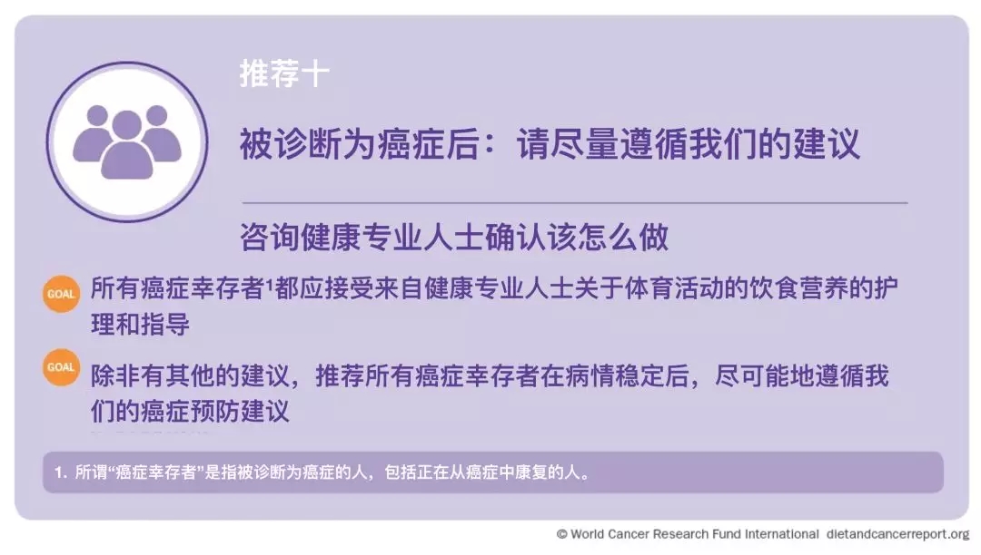 癌症幸存者越来越多,生存期越来越长,有可能发生新的癌症或其他非传染性疾病, 遵循本条建议可以提高生存率并降低癌症和其他非传染性疾病的风险。