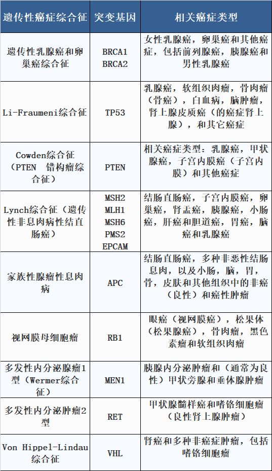 那么如何知道自己是不是有遗传性致癌突变呢?可以通过基因检测来评估,下面的列表包括一些可用于基因检测的最常见的遗传性癌症综合征,每种综合征中突变的基因,以及最常与这些综合征相关的癌症类型。