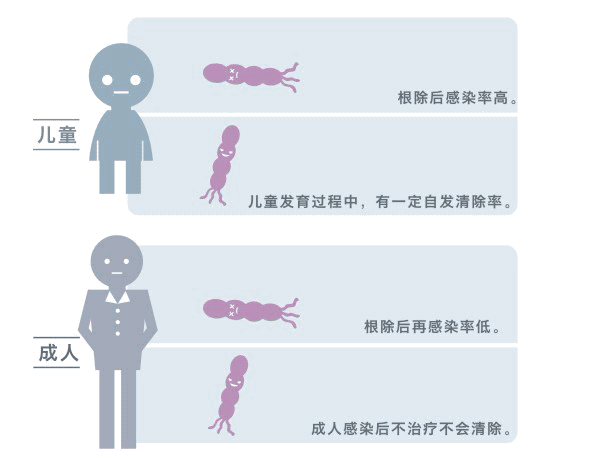 3.儿童在其生长发育过程中,有一定的自发清除率,大约10%左右;而成人HP感染,不经治疗,不可能自发清除。