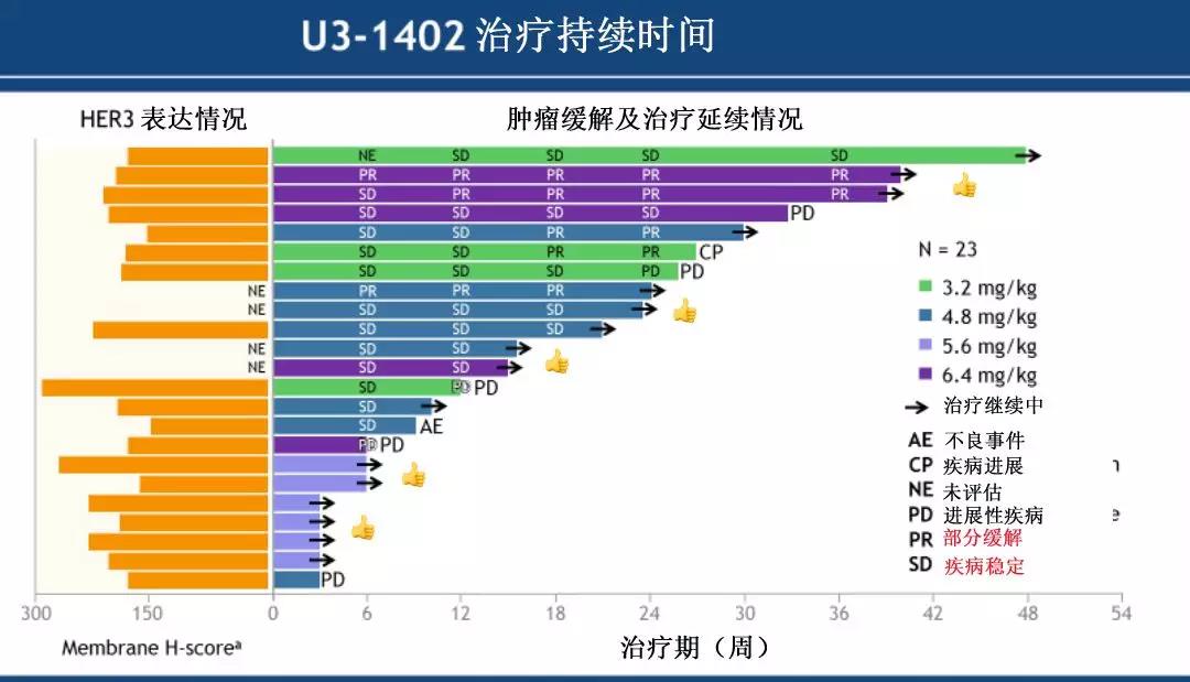 该项试验目前开展了4年,截至2019年2月25日,16位(70%)患者仍在接受U3-1402治疗。有三例患者有效时间已经超过9个月,中位无进展有效期PFS和总生存期OS仍未到达。
