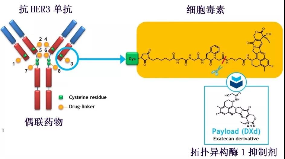 U3-1402是基于约57%-67%的EGFR突变NSCLC患者均携带HER3蛋白表达而研发的。它是一种靶向HER3的抗体偶联药物,让靶向HER3的单抗与一种新型的细胞毒素手拉手连起来,单抗那只“手”是“带路党”,将U3-1402精准广泛的邀请进肿瘤细胞内,然后U3-1402在肿瘤细胞里和单抗“分手”,释放出携带大量细胞毒素的另一只“手”,杀灭肿瘤细胞。