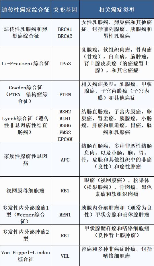 那么如何知道自己是不是有遗传性致癌突变呢?可以通过基因检测来评估,下面的列表包括一些可用于基因检测的最常见的遗传性癌症综合征,每种综合征中突变的基因,以及最常与这些综合征相关的癌症类型。