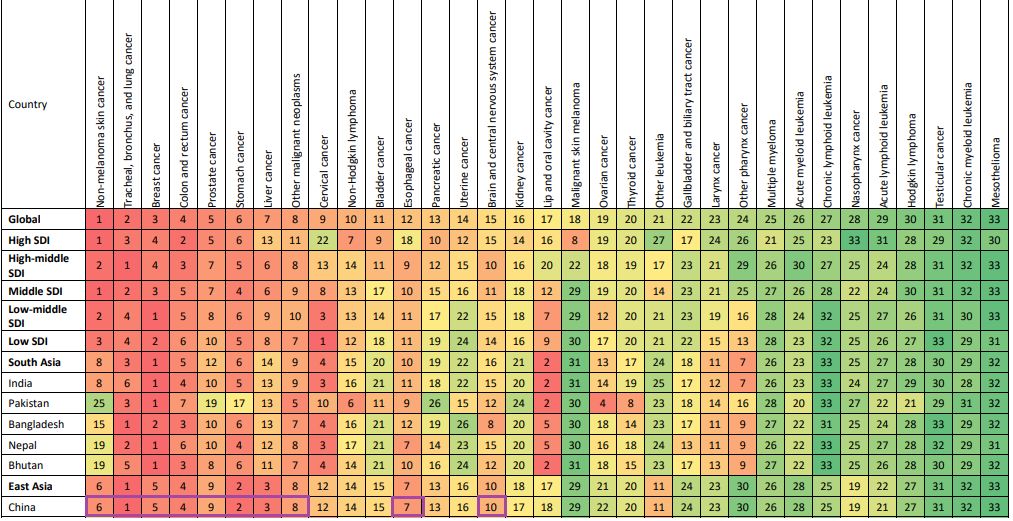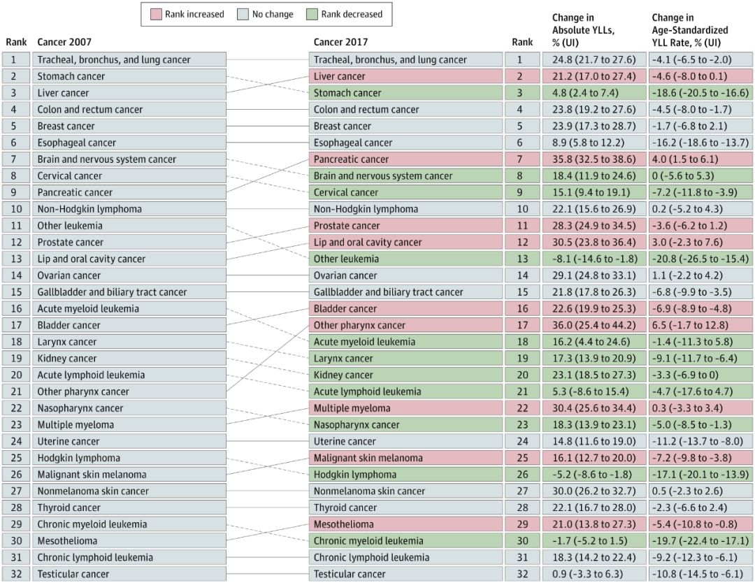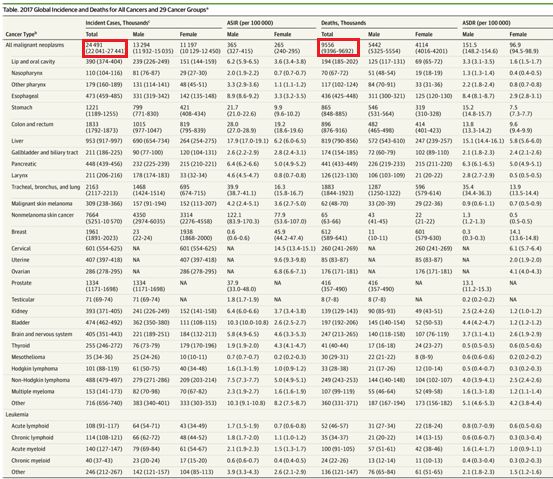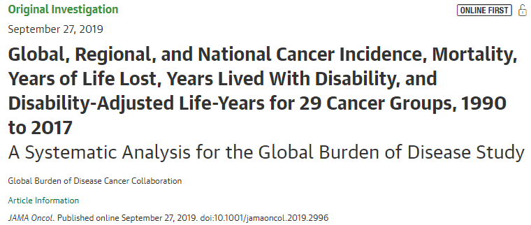 Global, Regional, and National Cancer Incidence, Mortality, Years of Life Lost, Years Lived With Disability, and Disability-Adjusted Life-Years for 29 Cancer Groups, 1990 to 2017A Systematic Analysis for the Global Burden of Disease Study, JAMA Oncol. Published online September 27, 2019. doi:10.1001/jamaoncol.2019.2996.