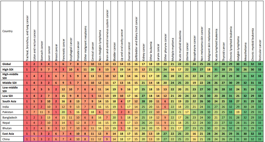 GDB研究中关于癌症负担的各国流行病学概况显示出巨大的异质性,这反映了不同的风险因素、经济环境、生活方式和获得诊疗的机会。
