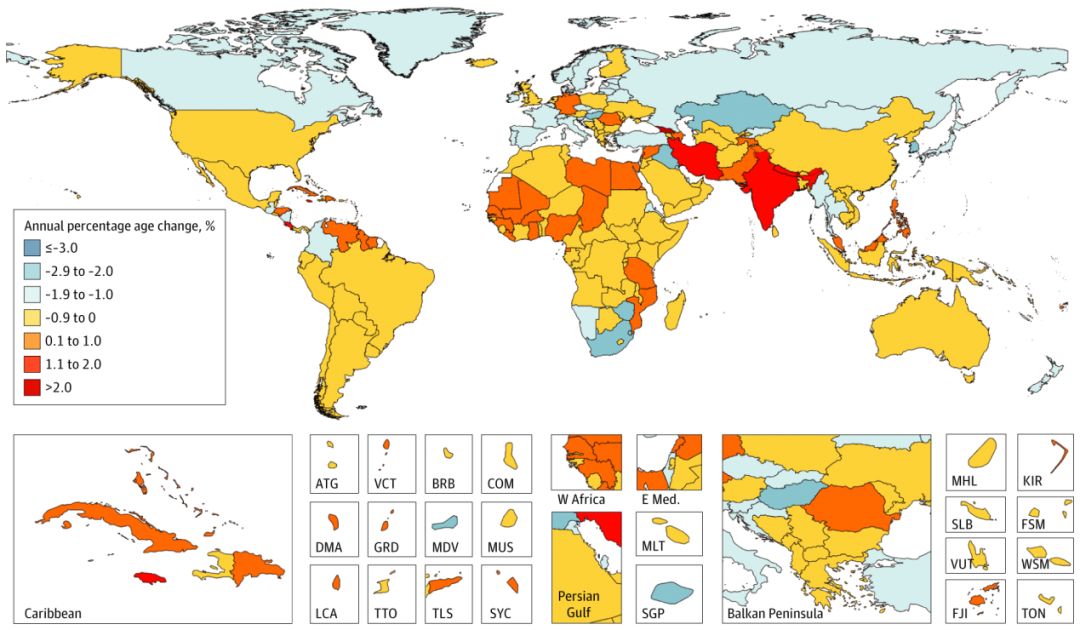 在2007至2017年的十年间,195个国家/地区中,有123个国家/地区的年平均癌症年龄标准化发病率有所上升(如图1所示),而有145个国家/地区的年平均癌症年龄标准化死亡率下降(如图2所示)。