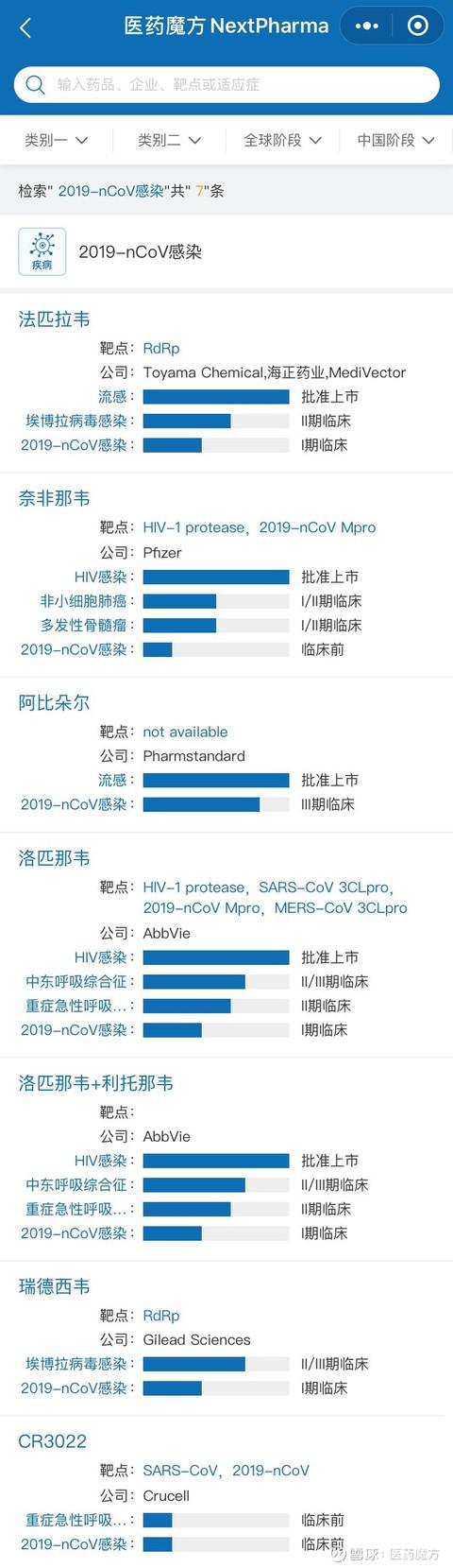 根据医药魔方 NextPharma 收录的信息,当前在研的抗 2019-nCoV 病毒感染项目已经有 7 个,除了最近几天为众人所知的阿比多尔、瑞德西韦(吉利德,RNA 聚合酶抑制剂)、法匹拉韦(海正,RNA 聚合酶抑制剂)、洛匹那韦(艾伯维,蛋白酶抑制剂)等小分子抗病毒药物外,还有诸如 CR3022 这样针对 S 蛋白的大分子单抗药物,只不过还处于临床前研究阶段。