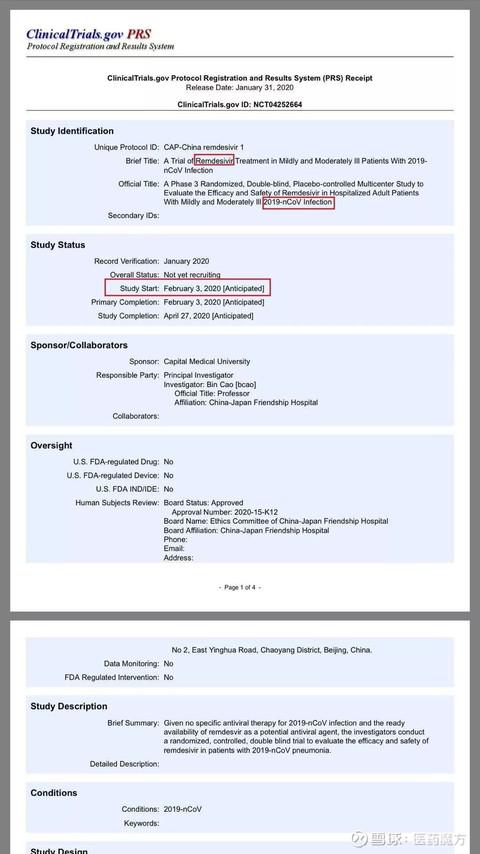 另外,吉利德 remdesivir 针对 2019-nCoV 感染的 III 期、随机、双盲、安慰剂对照试验虽然尚未正式公布,但是已经收到了 ClinicalTrials 的登记通知,显示该研究将于 2 月 3 日在中日友好医院正式启动。