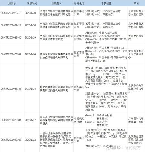 以「新型冠状病毒」为关键词在中国临床试验注册中心(网页链接)中检索发现,目前已经登记启动了 7 项研究,在武汉、广州、重庆、北京等 4 地开展,试验药物涉及中药、血必净注射液、糖皮质激素、利巴韦林 + 干扰素 α -1b、洛匹那韦 / 利托那韦 + 干扰素 - α 2b 等。