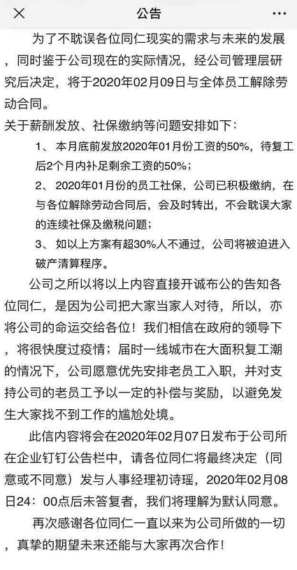 信中明确指出,公司于2月9日与全部200余名员工解除劳动合同,如果有30%的员工不同意,公司将进入破产清算的结果。