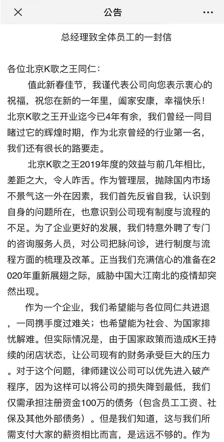 2月8日,北京K歌之王总经理致全体员工的一封信在网上流出后引起热议。