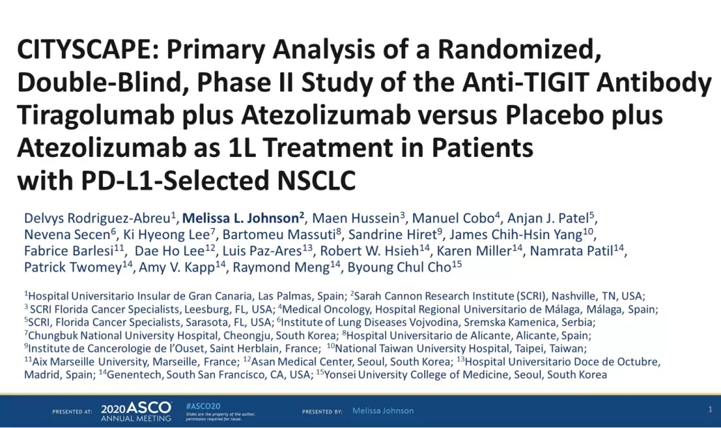 为了进一步验证Tiragolumab联合阿替利珠单抗一线治疗NSCLC患者的有效性与安全性,罗氏开展了Tiragolumab的II期临床研究CITYSCAPE。CITYSCAPE是一项在全球开展的前瞻性、随机、双盲、安慰剂对照II期临床研究,纳入了135例未经化疗的PD-L1阳性(经22C3 IHC pharmDx Dako检测,TPS≥1%)、局部晚期不可切除或转移性NSCLC患者。