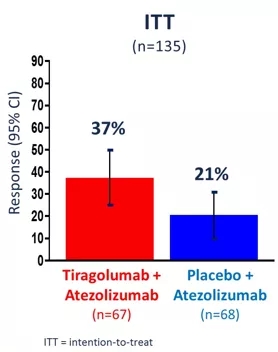 患者按照 1:1 的比例被随机分配接受Tiragolumab+阿替利珠单抗(TA组)或安慰剂+阿替利珠单抗(PA组)治疗,直至发生疾病进展或丧失临床获益,以比较Tiragolumab+阿替利珠单抗联合治疗与安慰剂+阿替利珠单抗治疗的有效性与安全性。共同主要终点为研究者评估的ORR和PFS。次要终点包括缓解持续时间(DOR),安全性和总生存期(OS)。探索性终点是PD-L1状态对ORR和PFS的影响。