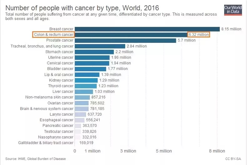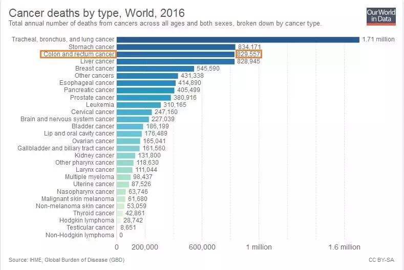 早在2016年的一组数据中统计,全球就有630万结直肠癌患者,在引起的死亡人数上,结直肠癌已经超过了肝癌,仅次于肺癌和胃癌之后,成为第三大致死癌症!