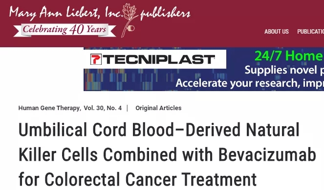《Human Gene Therapy》(人类基因疗法)杂志发表过一篇研究论文,研究者成功地将脐带血(UCB)中的NK细胞通过膜结合白细胞介素(IL)- 21进行扩增,命名为eUCB-NK细胞。通过研究发现,eUCB-NK细胞具有较强的体内外抗肿瘤活性,可能适用于中晚期结直肠癌患者。